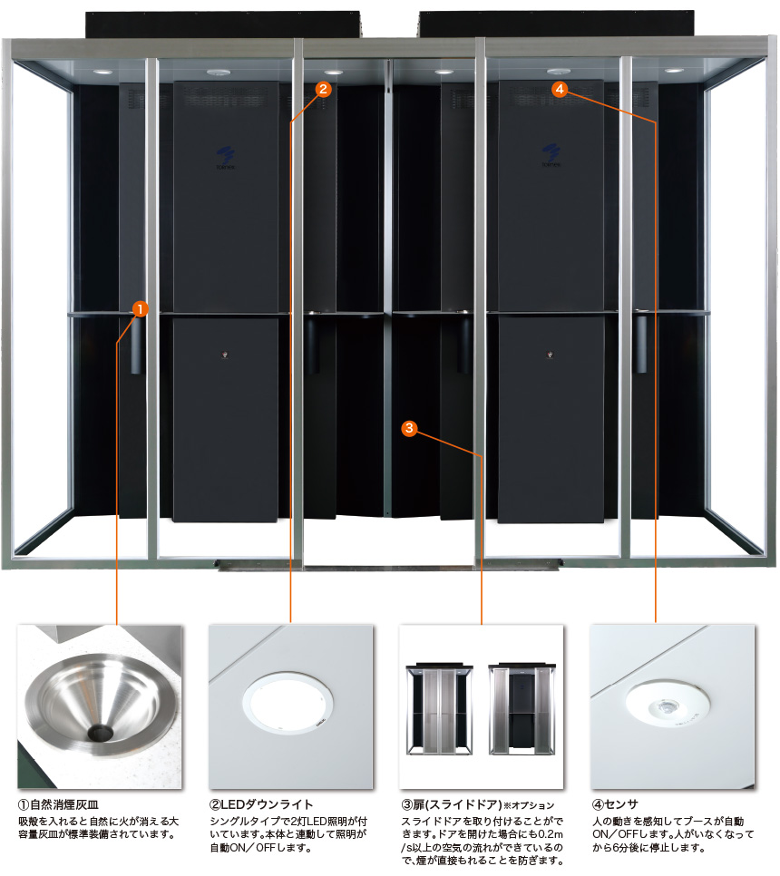 喫煙室としての機能をパッケージ化した製品です。屋内の空きスペースに設置し、電源につなぐだけで稼働するタイプ(循環型)と、排気ダクトにつなぐタイプがあります。 - メリット: