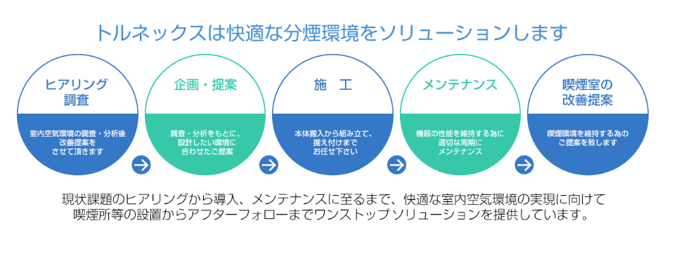 トルネックスでは、分煙対策の専門メーカーとして、換気・脱臭に関するトータルソリューションを提供しています。