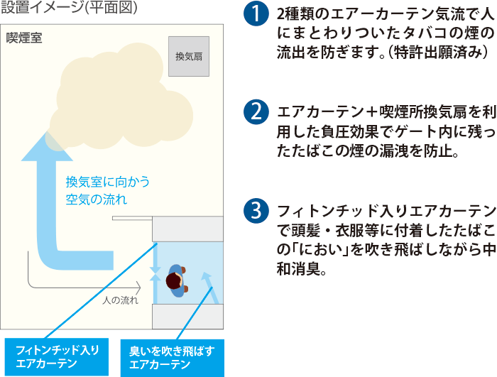喫煙者が通過する際に中和消臭剤を吹きかけ、喫煙者の衣服についたタバコ臭を消臭し、喫煙所の外での臭いの発生を抑えます。