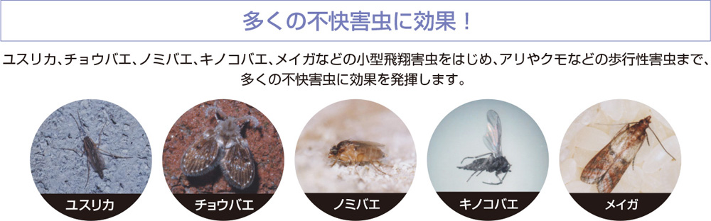 | 適用害虫 | ユスリカ、チョウバエ、ノミバエ、キノコバエ、メイガ、羽アリ |