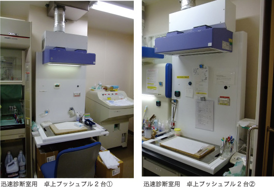 2014年5月の大学病院本館の移転新築にともない、排気ファンつき卓上プッシュプル換気装置(LP-60TU+LP-60FU)を手術臓器処理室に2台、病院病理部迅速診断室に2台、検体処理室に1台、剖検臓器保管室に剖検の切り出し用として2台の合計7台、また、手染色や手封入時に使用するキシレン対策として、検体処理室に1台の有機溶剤発散防止装置(LK-30)をご導入いただきました。各室内での全体換気とともに、各作業箇所にて局所排気することで、特定化学物質障害予防規則や有機溶剤中毒予防規則、女性労働基準規則等で求められる様々な化学物質曝露対策と感染対策を実施しています。