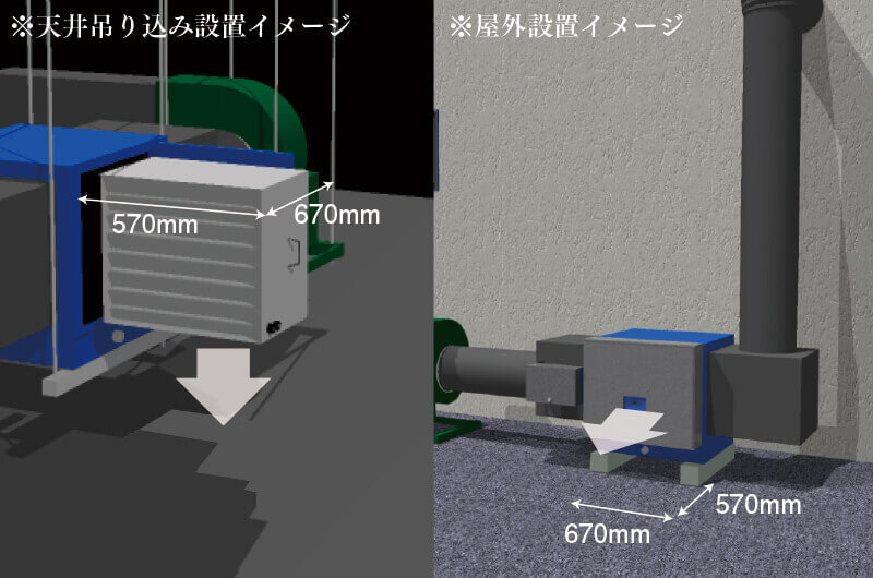 天井吊り込み設置、屋外設置ともにフィルタを取り出せるスペースを必ず確保してください。