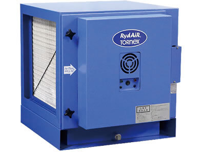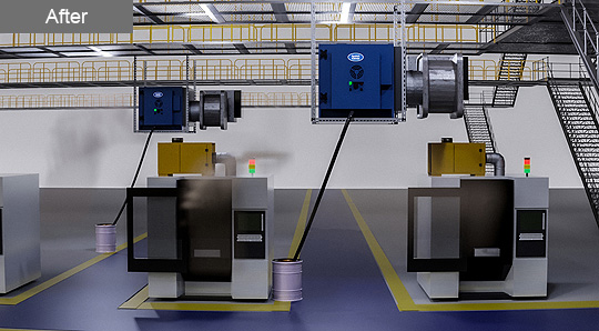 空間設置したリドエアートルネックスが工場内に拡散したオイルミストを集塵したイメージ