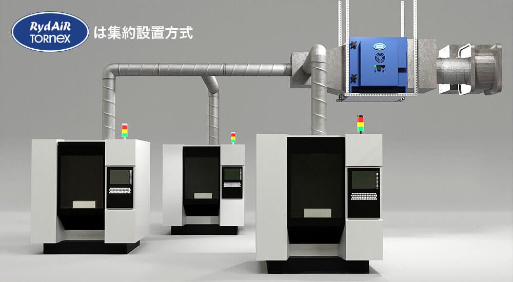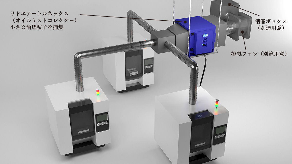 リドエアートルネックスをダクト接続せず空間設置し内気循環することで、既設のフィルタ式オイルミストコレクターの目詰まりやオープンタイプの工作機械由来の工場内に拡散したオイルミストを集塵し、作業スタッフの健康障害や事故を防止します。