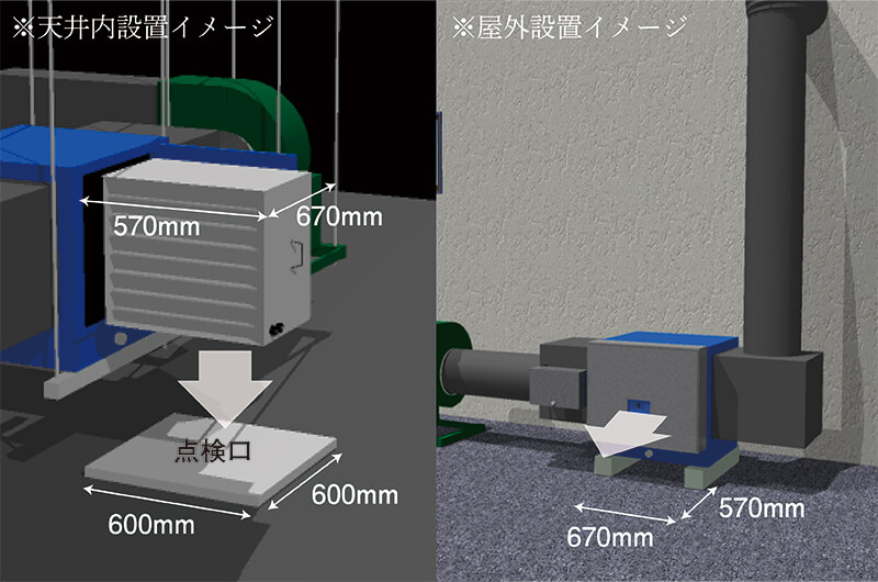従来のオイルミストコレクターと比較して低コストで導入が可能。大風量のファンにも対応し、省スペースタイプで屋内、屋外のどちらでも設置可能です。