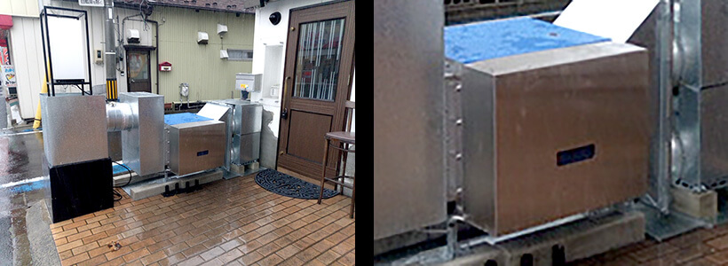 マンションの1階にもつ焼き店をオープンするにあたり、マンションオーナーから「近隣住民に対するニオイ対策をして欲しい」との要望がありました。対策方法を検討した結果、リドエアートルネックスのオイルミストコレクターと中和消臭装置を各1台導入しました。